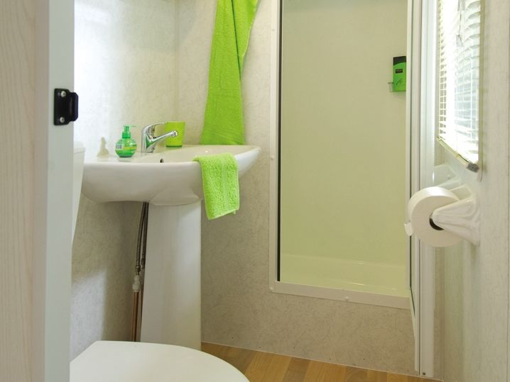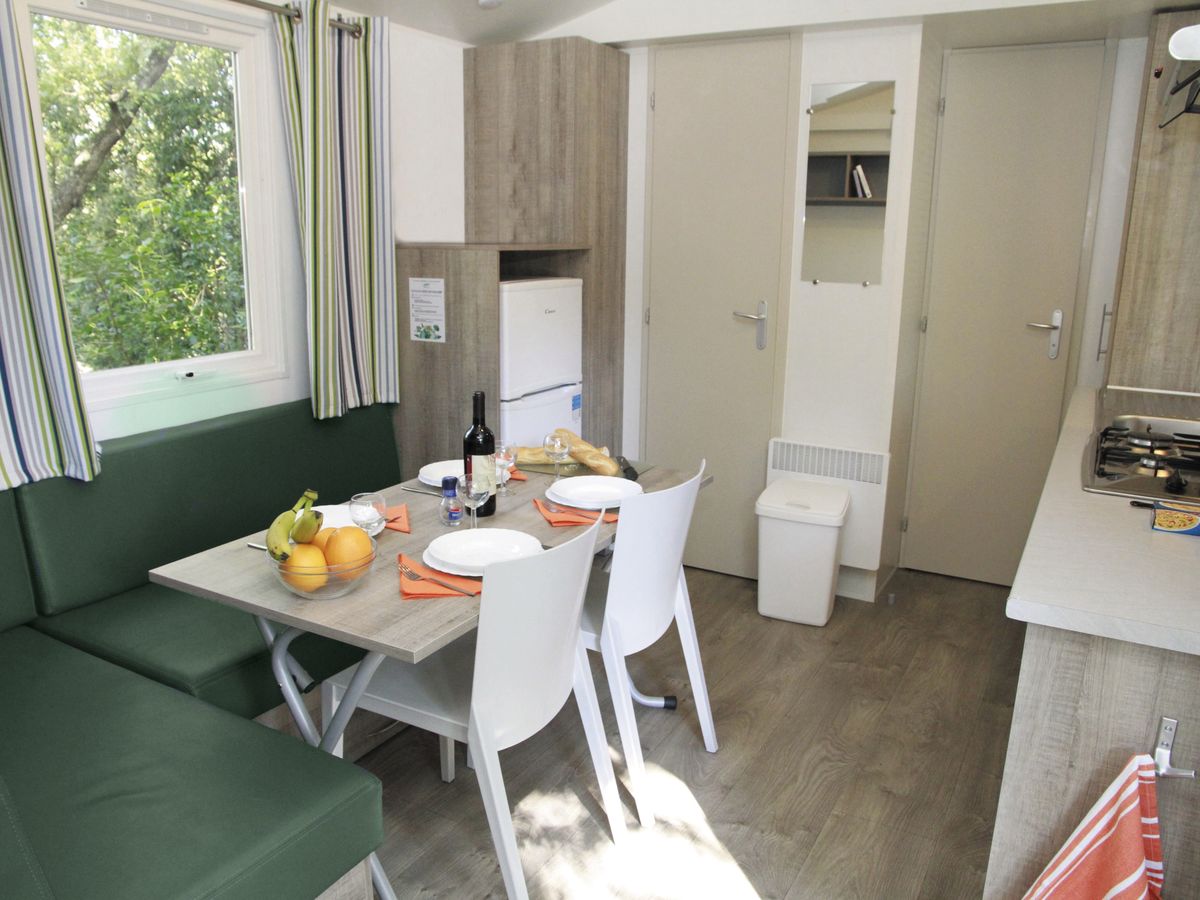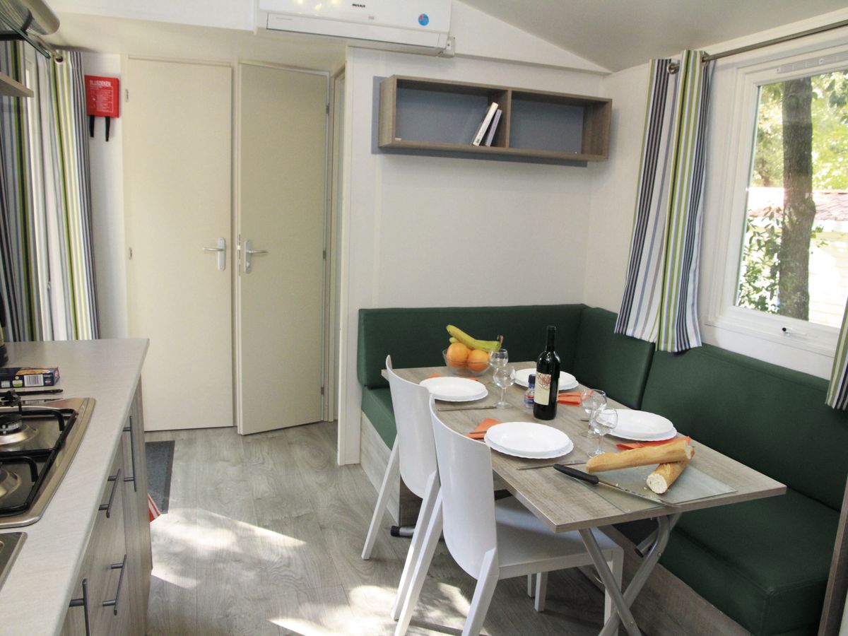 Notre mobil-home Comfort est convivial et dispose d’un grand salon climatisé avec un coin repas, équipé d’un banc confortable et de nombreux rangements. L’équipement standard de la cuisine comprend un réfrigérateur, une cuisinière à gaz 4 foyers et des ustensiles de cuisine. La salle de bain comporte une cabine de douche, un lavabo et des toilettes.
