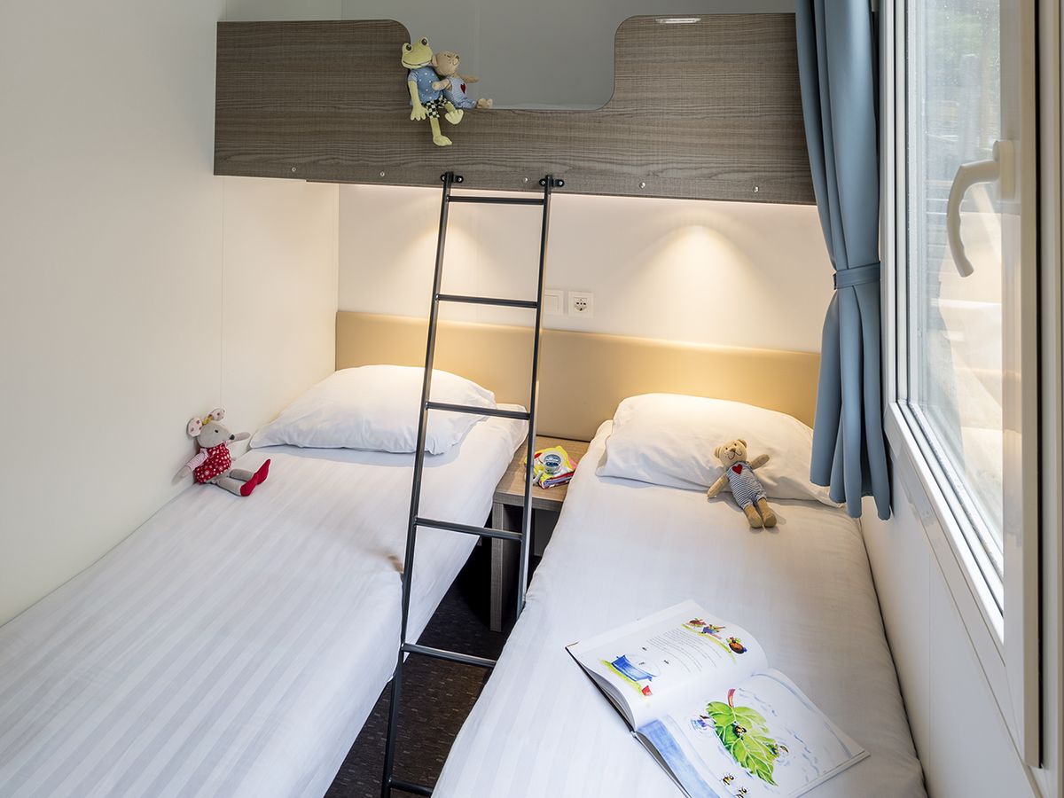 Le mobil-home Comfort a 2 chambres. La chambre des parents dispose d’un grand lit 200 x 140 cm. La disposition des lits dans la deuxième chambre varie d’un camping à l’autre : soit un petit lit et des lits supposés (75 kg max.), soit 2 petits lits et un lit mural. Certains campings ont seulement des lits superposés. Dans ce cas, le canapé du salon se convertit en lit. Une barrière de lit est fournis et les fenêtres des chambres sont munies de moustiquaires. Les couettes 1 personne et les oreillers sont fournis.