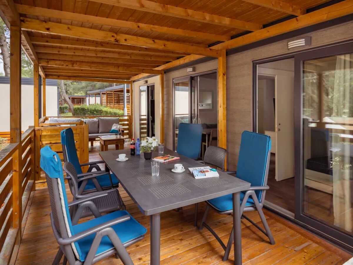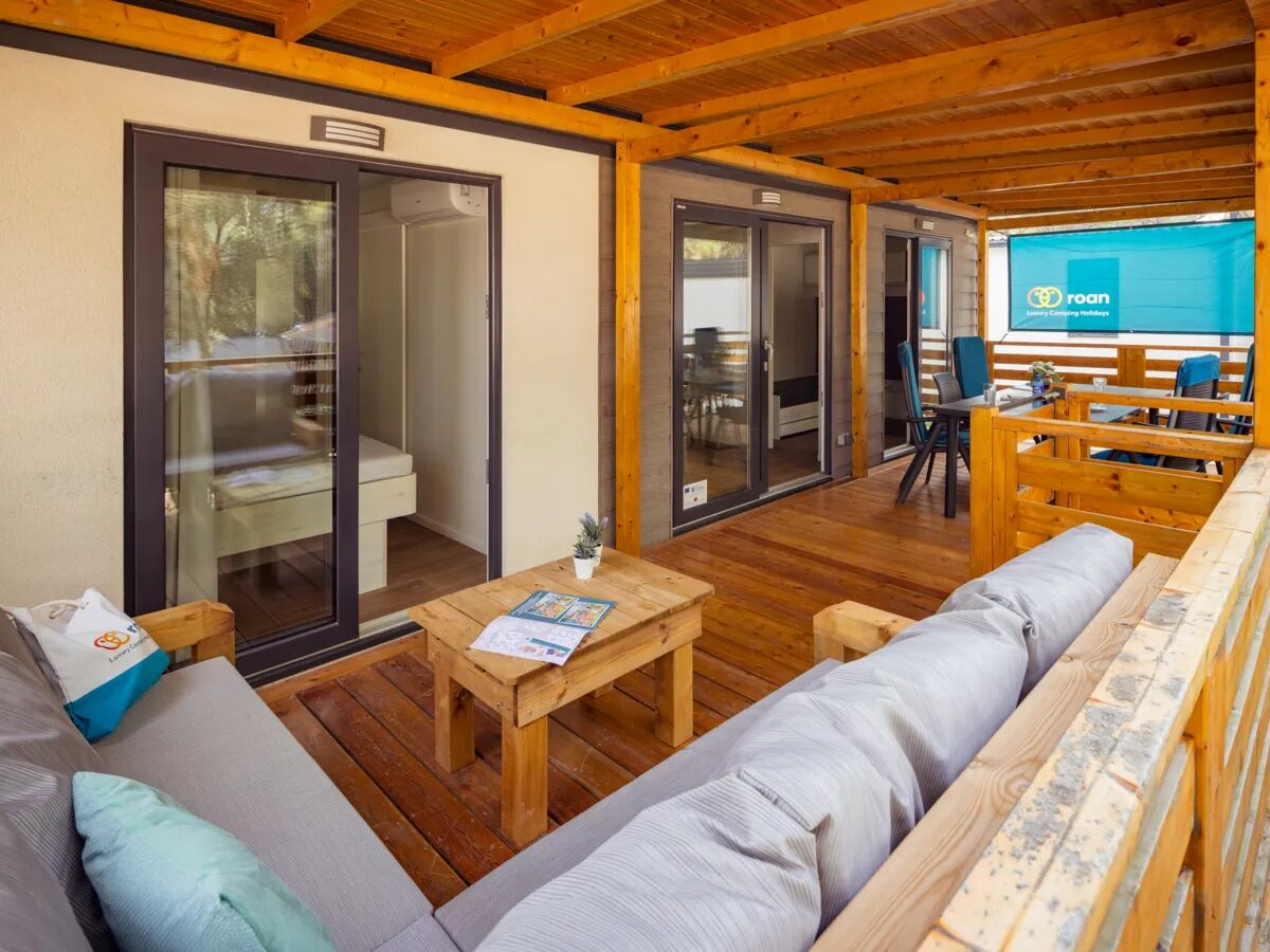 Airco SAT-TV Véranda Clôture de véranda Canapé-lounge 2 salles de bainNotre mobile home Comfort Plus Lounge est équipé d'une véranda luxueuse, d'un mobilier de jardin luxueux et d'un canapé confortable avec des coussins.