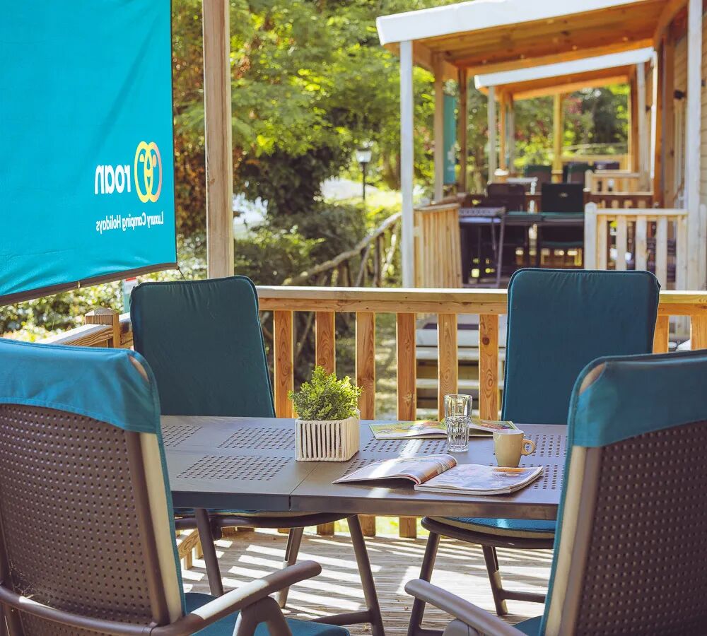 Encore un atout du mobile home Premium Compact sans TV est la grande véranda (semi) couverte de 15 m2, sur laquelle vous pouvez toujours vous asseoir à l'extérieur et profiter du soleil. La véranda est aussi prévue d'une bannière solaire Roan qui vous protège du soleil bas et qui vous donne plus de privacy. le mobile home est équipé de meubles de jardin de qualité. Sur la page du camping, vous pouvez lire quelle plaque de barbecue/grill gratuite est disponible dans votre hébergement.