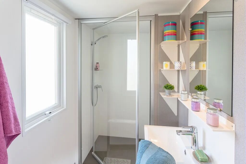 Le mobile home Premium Compact sans TV a 3 chambres à coucher: 1 avec un grand lit de 1.60 x 1.90 mètres et dans les chambres pour les enfants chaque chambre a 2 lits simples. Standard il y a un support de lit présent dans le mobile home, lequel vous pouvez glisser sous le matelas vous même pour empêcher votre tout-petit de rouler hors du lit.