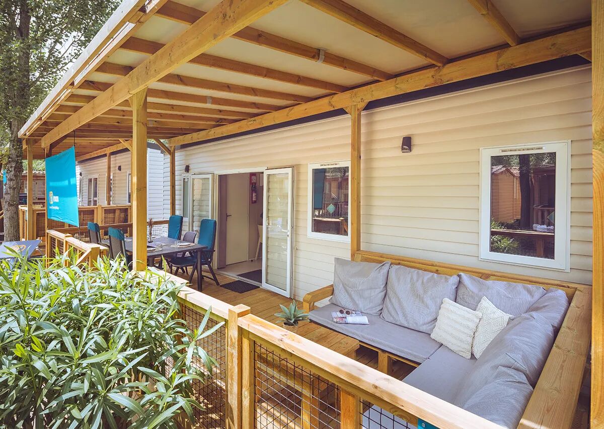Encore un atout de ce mobil home Premium Lounge est la grande véranda couverte où l'on peut toujours s'asseoir à l'extérieur et profiter du soleil. La véranda est équipée avec un Roan sunbanner contre le soleil bas, qui donne plus de privacy et il y a aussi des meubles de jardin modernes présent. Sur la page du camping, vous pouvez lire quelle plaque de barbecue/grill gratuite est disponible dans votre hébergement.
