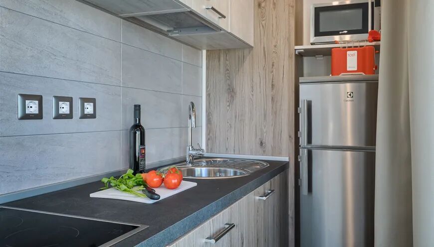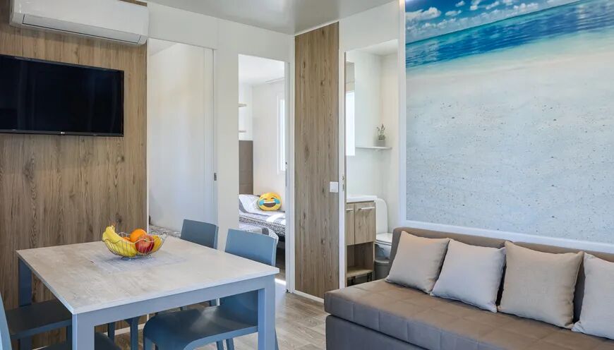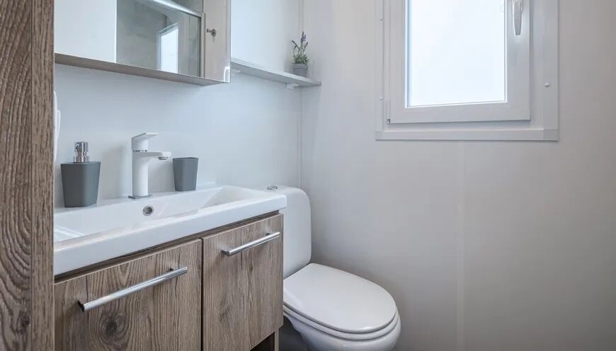 La cuisine très bien équipée dispose, entre autres ,d'un réfrigérateur avec compartiment congélateur, d'une cuisinière à gaz à 4 feux, d'un micro-ondes, d'une machine à café Nespresso, d'une bouilloire et d'un lave-vaisselle. Une télévision par satellite est installée dans le salon. Pour plus de confort, ce mobil-home dispose de deux salles de bains. La salle de bains attenante à la chambre double dispose d'une cabine de douche spacieuse, d'un lavabo et de toilettes. Et l’autre salle de bains est aussi bien aménagée.