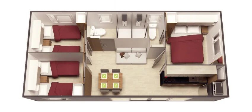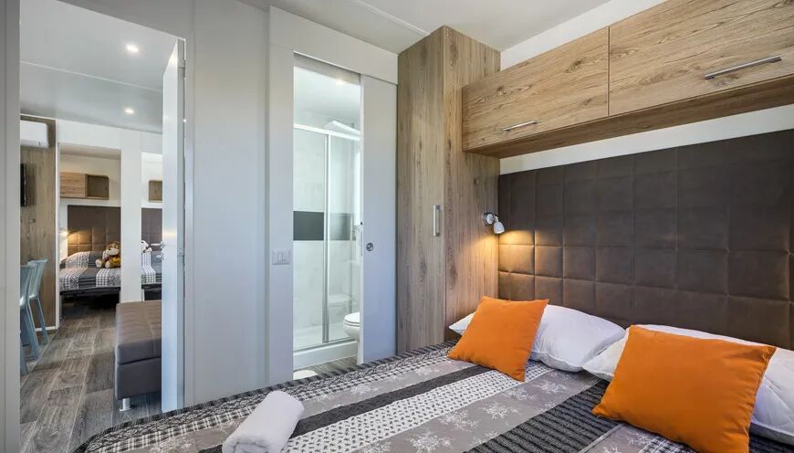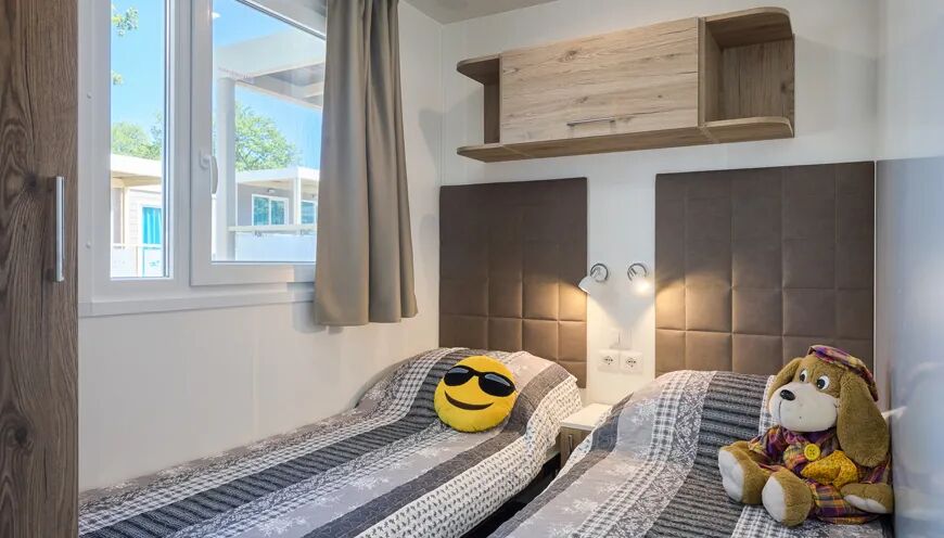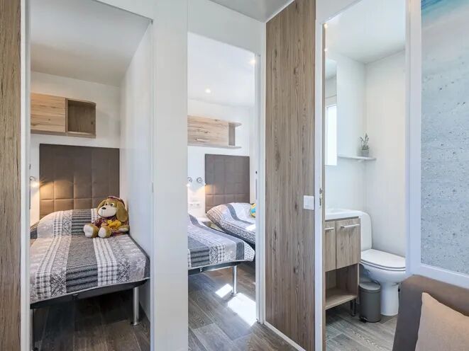 Ce mobil-home de luxe dispose de 3 chambres à coucher. La chambre principale est équipée d'un lit double de 2,00 x 1,60 m. Les 2 autres chambres disposent de 2 lits simples de 2,00 x 0,80. Chaque mobil-home est équipé en standard d'une barrière de lit et toutes les fenêtres des chambres sont munies de moustiquaires.