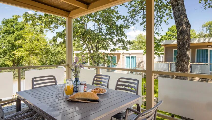 Un avantage supplémentaire de ce mobil-home Premium est la véranda spacieuse de 26 m², couverte aux trois quarts, où vous pourrez vous asseoir confortablement à l'extérieur à n'importe quel moment de la journée. Le luxueux salon de jardin se compose d'une grande table, de six fauteuils et de deux chaises longues. Sur la page du camping, vous pouvez lire quelle plaque de barbecue/grill gratuite est disponible dans votre hébergement.