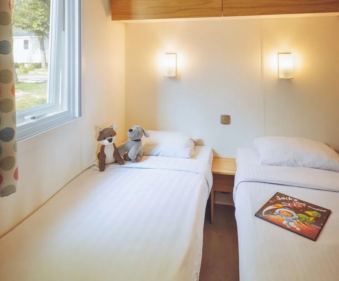 Le mobil-home Premium Relax a 3 chambres, une avec un grand lit de 160 x 200 cm et deux chambres d’enfant avec chacune 2 petits lits, dont l’un se range sous l’autre pour créer de la place pour les bagages ou un lit-bébé ! Une barrière de lit fait partie de l’équipement standard pour la sécurité de votre enfant en bas âge. Toutes les fenêtres des chambres sont munies de moustiquaires.