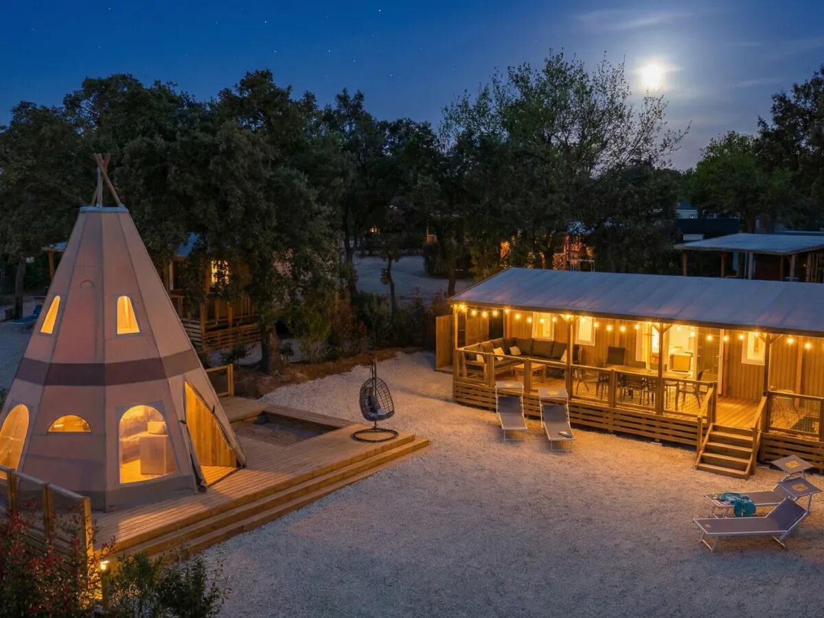 Depuis la véranda du mobil-home, vous entrez directement dans le salon et la cuisine. Le salon est décoré avec style et très bien équipé. Il y a des jeux de société amusants pour toute la famille dans le mobil-home et un haut-parleur avec lumière intégrée pour écouter votre musique préférée. Vous pouvez vous détendre sur le confortable canapé et profiter de la télévision par satellite, vous bénéficiez de presque toutes les chaînes de télévision que vous pouvez regarder à la maison ! La télévision par satellite est également équipée d'un port USB qui permet de lire des fichiers MPEG4. La cuisine est spacieuse et dotée d'un équipement très complet ! Elle comprend un lave-vaisselle, un grand réfrigérateur avec compartiment congélateur séparé, une machine à café Nespresso, un micro-ondes et une bouilloire. Il y a une salle de bain avec une cabine de douche spacieuse et un lavabo avec eau chaude. L'autre salle de bains, attenante à l'une des chambres doubles, est équipée d'une cabine de douche spacieuse et d'un lavabo avec eau chaude. Pour encore plus de confort, il y a 2 toilettes séparées. La tente tipi est équipée de l'air conditionné, de 2 grands poufs et d'une télévision. Il y a également une salle de bain avec douche, lavabo et toilettes.