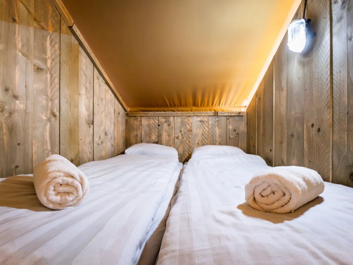 La chambre principale dispose d'un grand lit double et la deuxième chambre de deux lits simples. Les enfants adoreront la troisième chambre. Ils peuvent y dormir à deux dans un lit d'appoint confortable. Pour encore plus de confort, nos tentes lodge sont équipées d'oreillers et de couettes simples. Vous pouvez réserver gratuitement un cadre de lit pour votre enfant.